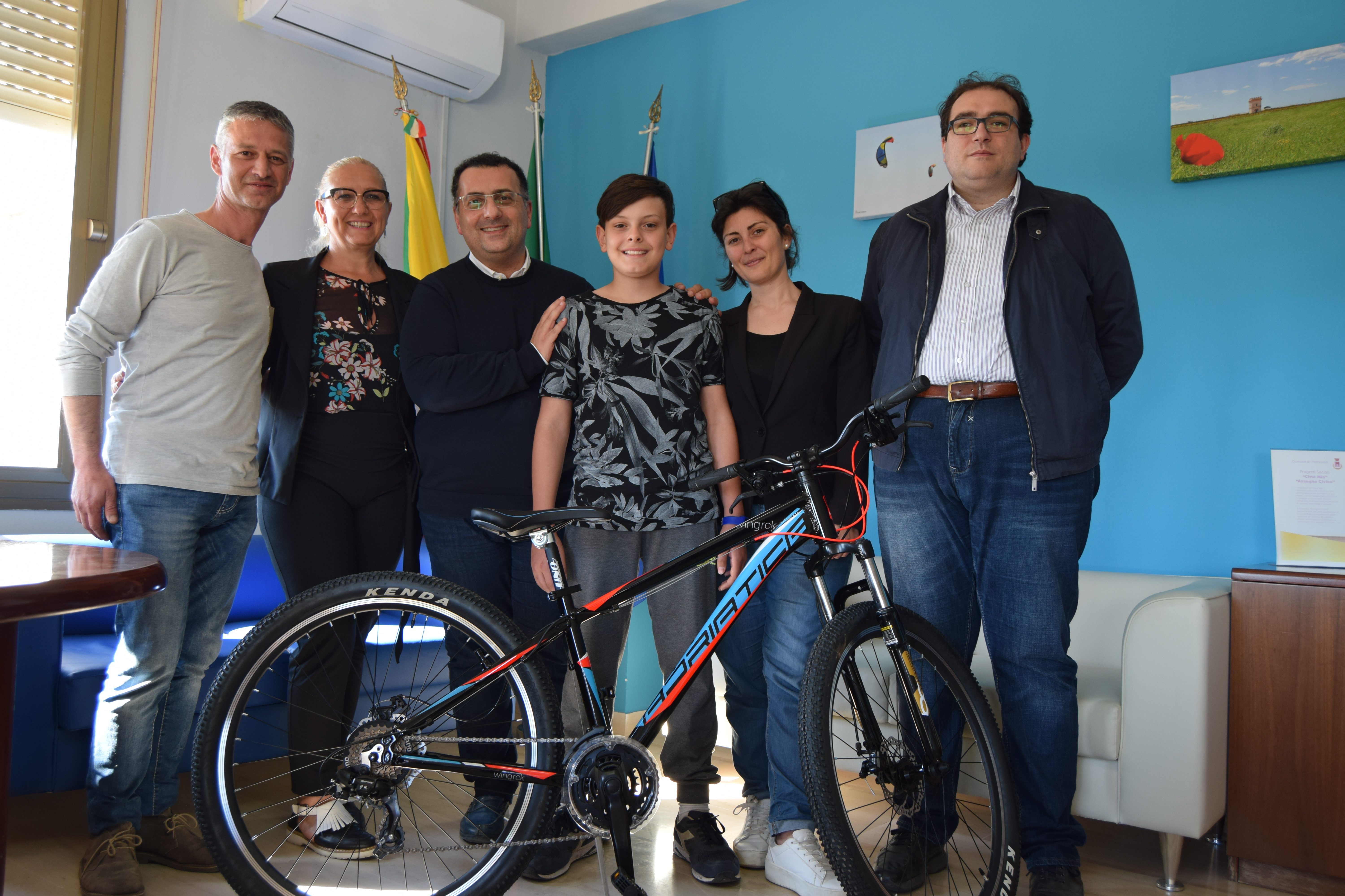 E’ stato lo stesso primo cittadino, assieme al vicesindaco Marcella Pellegrino e agli assessori Federica Cappello e Roberto Angileri, a consegnare personalmente la bici al giovane studente. La consegna è avvenuta ieri pomeriggio al palazzo municipale. Presente anche il dirigente scolastico dell’istituto Gesualdo Nosengo, Giuseppe Inglese.