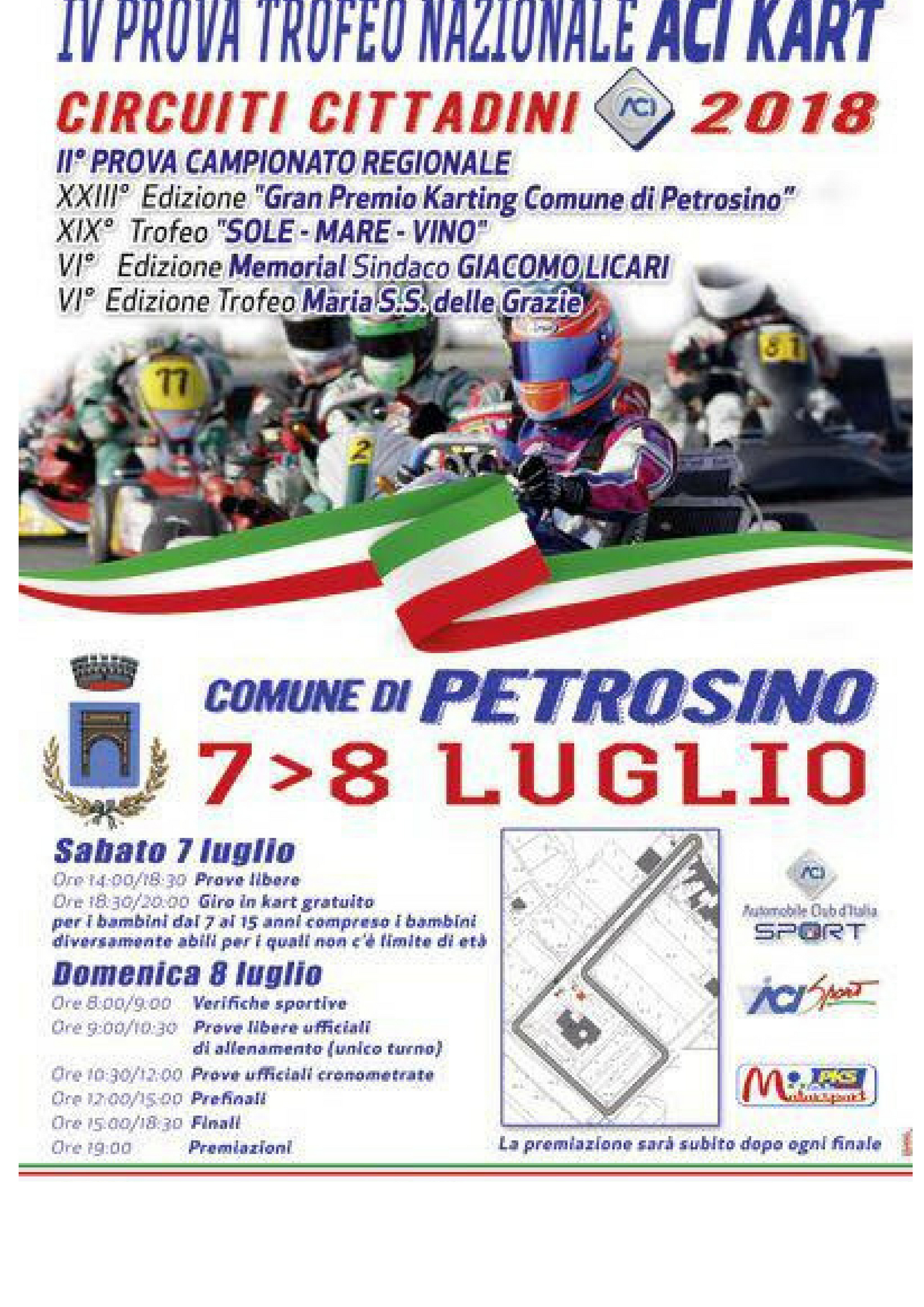 Entra nel vivo “Petrosino Estate 2018”, il cartellone delle manifestazioni estive promosso dall’amministrazione comunale guidata dal Sindaco Gaspare Giacalone. Nel weekend è in programma la 23esima edizione del “Gran Premio Karting Comune di Petrosino – XIX Trofeo Sole - Mare - Vino – VI Memorial Sindaco Giacomo Licari – VI Edizione Trofeo Maria Ss. delle Grazie”. La gara, valida come seconda prova del campionato regionale dei circuiti cittadini targato Aci, è organizzata dall’Asd Karting Club Triscina e si snoderà lungo il seguente percorso: via X luglio, viale Francesco De Vita, viale Giacomo Licari e piazza della Repubblica.