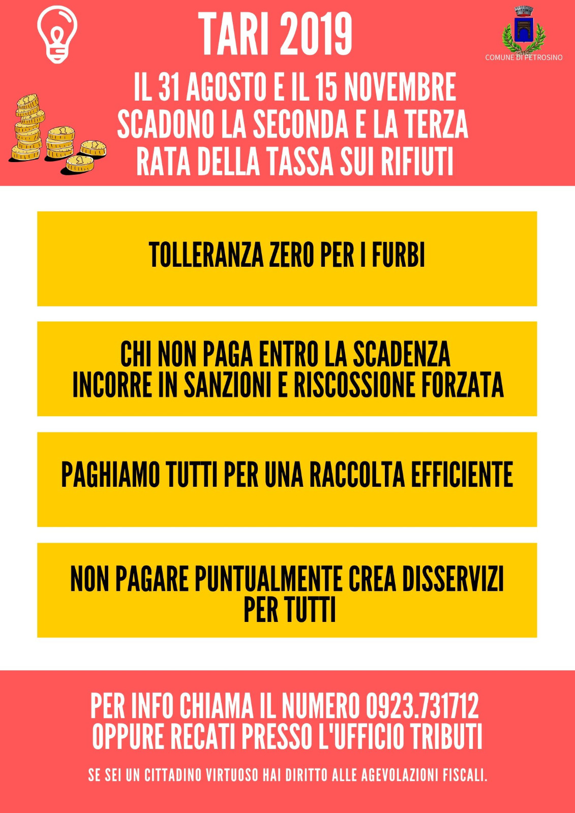 L’ufficio tributi del Comune di Petrosino ricorda alla cittadinanza che il 31 agosto scade la seconda rata della Tari 2019. Si invitano gli utenti a rispettare il termine per il pagamento della tassa sui rifiuti, così da evitare sanzioni e costi in più. Per l’occasione, l’Amministrazione comunale guidata dal Sindaco Gaspare Giacalone ha deciso di avviare anche una campagna pubblicitaria sul social network Facebook per ricordare la scadenza di fine mese e anche per evidenziare i motivi per cui è importante pagare tutti regolarmente entro il 31 agosto.