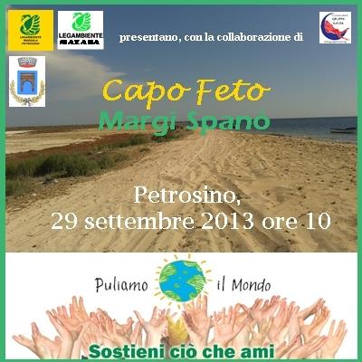 Domenica 29 Settembre 2013 a partire dalle ore 10,00, si terrà a Petrosino la manifestazione "Puliamo il Mondo". L’iniziativa, condivisa dal Comune di Petrosino, è promossa dal circolo Legambiente Marsala-Petrosino - diretto da Letizia Pipitone - con la collaborazione del circolo Legambiente Mazara, vedrà i volontari di Legambiente e i ragazzi dell’Associazione Culturale Gruppo Musa pulire la zona di Capo Feto e l’area dei Margi Spanò che costituiscono una delle più grandi risorse naturali di Petrosino.