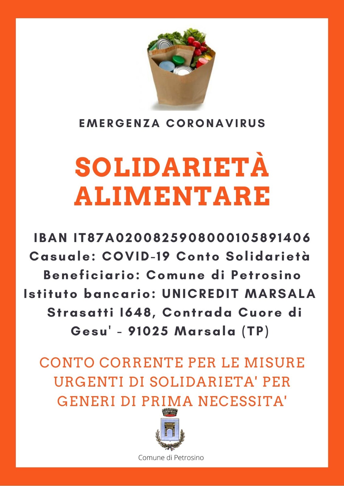 IT87A0200825908000105891406. Casuale: Covid-19 Conto Solidarietà. Beneficiario: Comune di Petrosino. Banca Unicredit (filiale Strasatti 1648 - Contrada Cuore di Gesù 91025 Marsala)