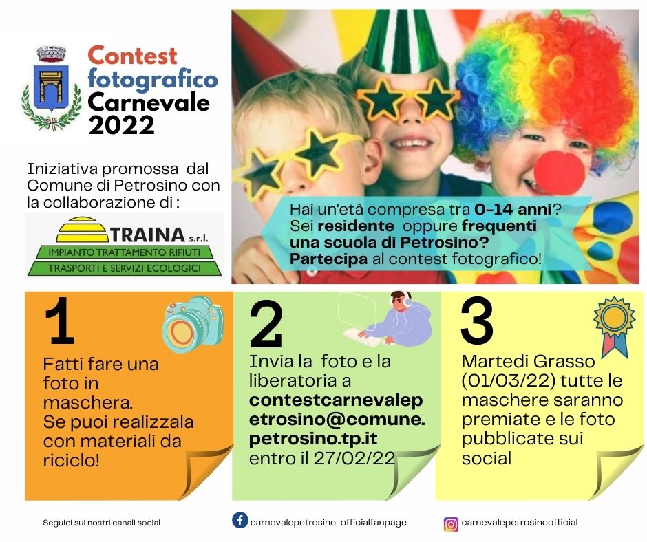 Si svolgerà a Petrosino il “Contest Fotografico Carnevale 2022”. All’iniziativa potranno partecipare tutti i bambini di età compresa tra 0 e 14 anni, che siano residenti a Petrosino o che frequentino l’Istituto Comprensivo Gesualdo Nosengo. I partecipanti dovranno inviare la propria foto di Carnevale all’indirizzo mail contestcarnevalepetrosino@comune.petrosino.tp.it . Le foto dovranno essere inviate entro e non oltre il 27 febbraio 2022. Nella mail dovranno essere indicati nome e cognome del partecipante, la data di nascita, l’indirizzo di residenza, la scuola di frequenza, nonché i nomi e i cognomi dei genitori. Alla mail dovrà anche essere allegato il modulo di consenso firmato dai genitori del partecipante per la pubblicazione della foto di Carnevale all’interno di un video che verrà realizzato dal Comune e che verrà pubblicato sui profili social dell’ente il 1° marzo 2022. Il Contest prevede la consegna (la cui modalità verrà comunicata in seguito) di premi simbolici per tutti i partecipanti.