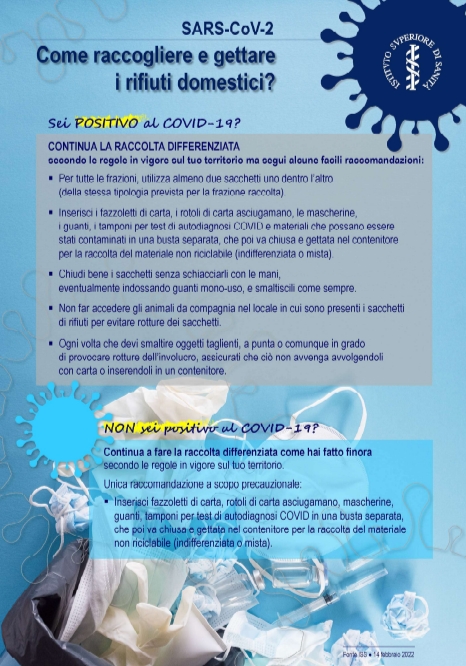 Tuttavia, si raccomanda comunque che, a scopo cautelativo, fazzoletti di carta, carta in rotoli, mascherine e guanti, tamponi per test per autodiagnosi COVID-19 eventualmente utilizzati, siano smaltiti nei contenitori (sacchi o buste) dei rifiuti indifferenziati.