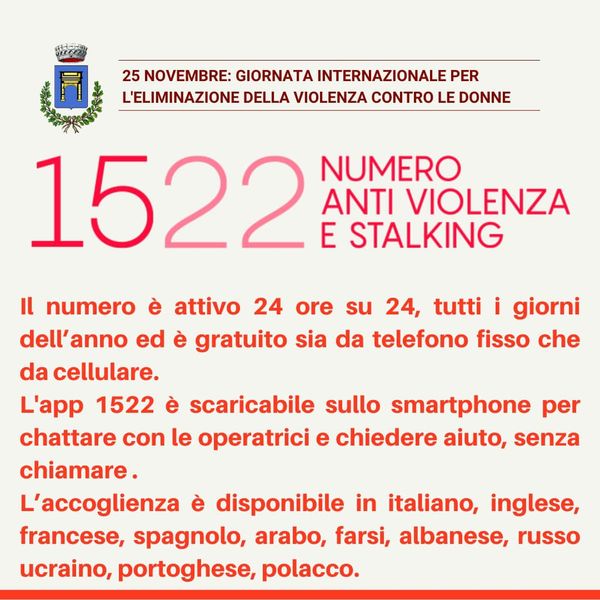 Vi ricordiamo che per richieste di aiuto e sostegno alle vittime di violenza e stalking è possibile contattare il 1522. Il numero è gratuito e attivo h24, tutti i giorni dell’anno.