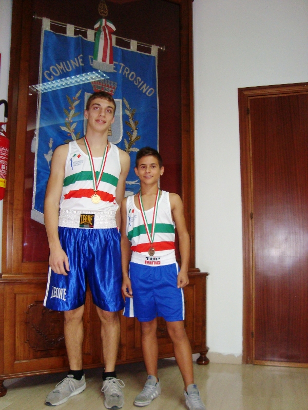 Ancora tante soddisfazioni dai giovani rappresentati della boxe petrosilena. Sono due, infatti, le medaglie d’oro conquistate da Antonino Maniscalco e Giuseppe De Vita ai campionati italiani di boxe che si sono svolti dal 7 al 9 novembre a Roccaforte di Mondovì (Cuneo). Ieri i due giovani atleti della Palestra “Van Damme” di Petrosino, sono stati ricevuti da Sindaco Giacalone, dal vice Marcella Pellegrino e dall’ass. Federica Cappello. Antonino aveva al collo la sua bella medaglia di Campione d’Italia 2014 della categoria “Junior 80 kg”, Giuseppe, quella della categoria “Schoolboy 40 kg”.
