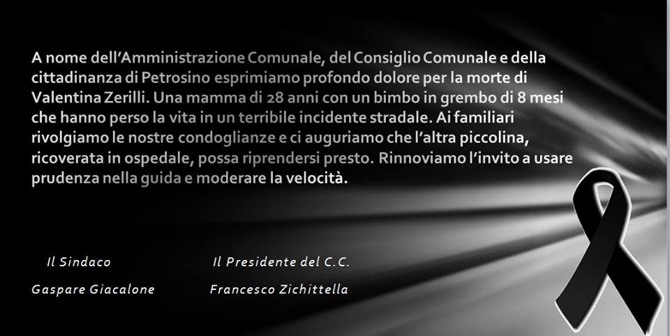 A nome dell'Amministrazione Comunale, del Consiglio Comunale e della cittadinanza di Petrosino esprimiamo profondo dolore per la morte di Valentina Zerilli. Una mamma di 28 anni con un bimbo in grembo di 8 mesi che hanno perso la vita in un terribile incidente stradale. Ai familiari rivolgiamo le nostre condoglianze e ci auguriamo che l'altra piccolina, ricoverata in ospedale, possa riprendersi presto. Rinnoviamo l'invito a usare prudenza nella guida e moderare la velocità.