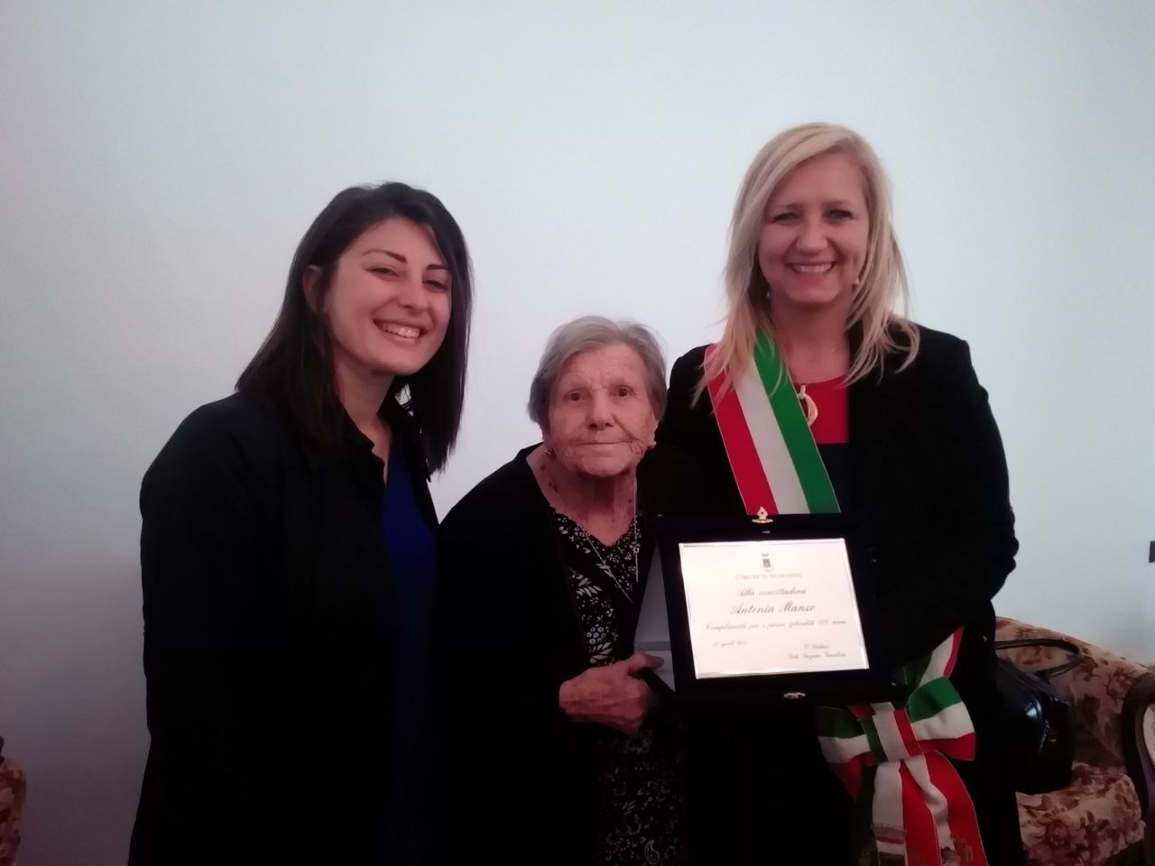 “Gli anziani sono un orgoglio per noi, a maggior ragione quando raggiungono il traguardo dei cento anni, - le parole del vice-sindaco -. Per la loro grande esperienza e saggezza, hanno sempre qualcosa da insegnarci”. Alla signora Antonia Manzo è stata consegnata una targa ricordo da parte da parte dell’amministrazione comunale.