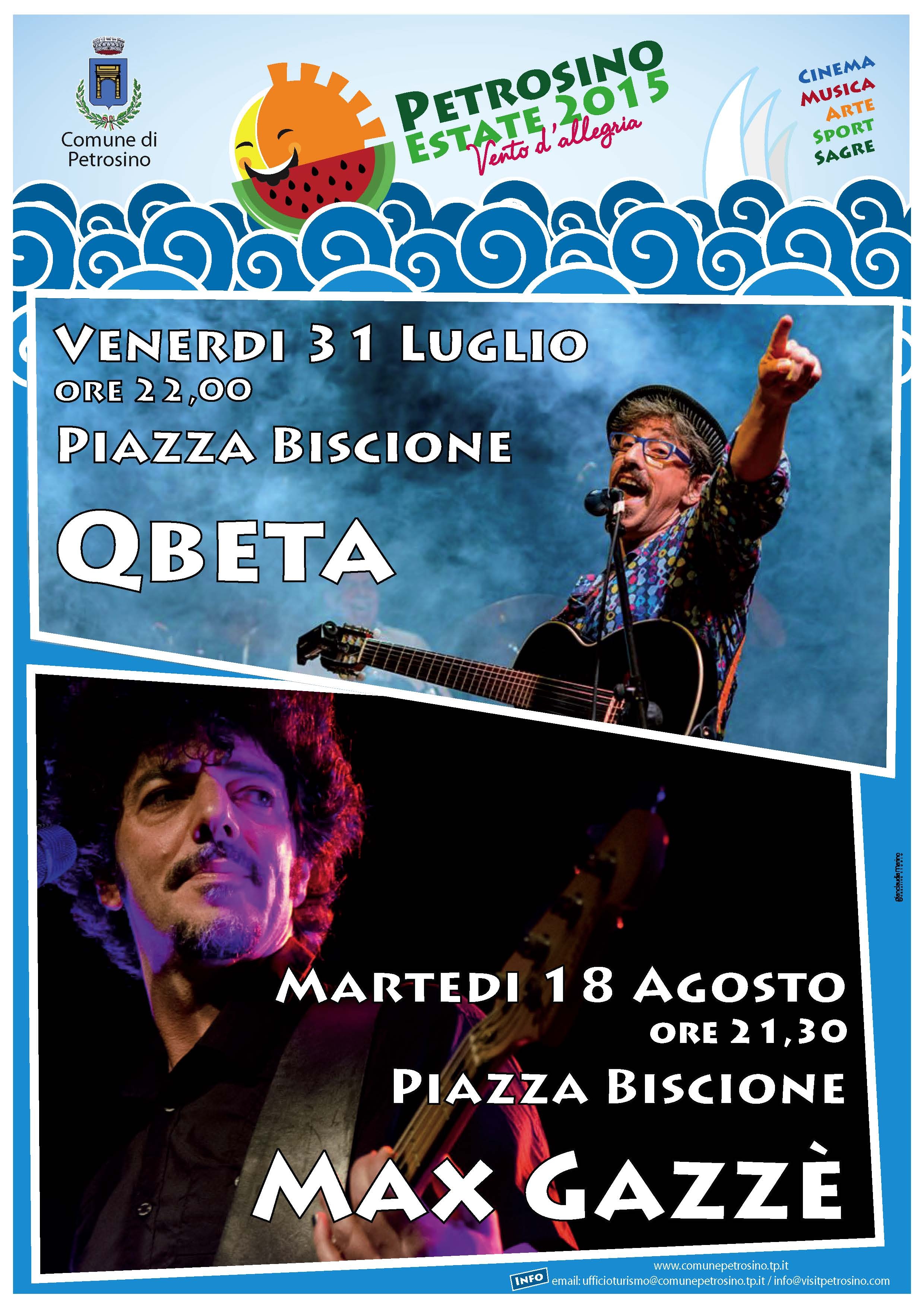 Anche quest’anno la grande musica live torna ad essere protagonista di Petrosino Estate 2015. Due gli eventi clou del cartellone. Venerdì 31 luglio il concerto in piazza Biscione dei Qbeta e martedì 18 agosto quello dell’istrionico cantautore romano Max Gazzè.