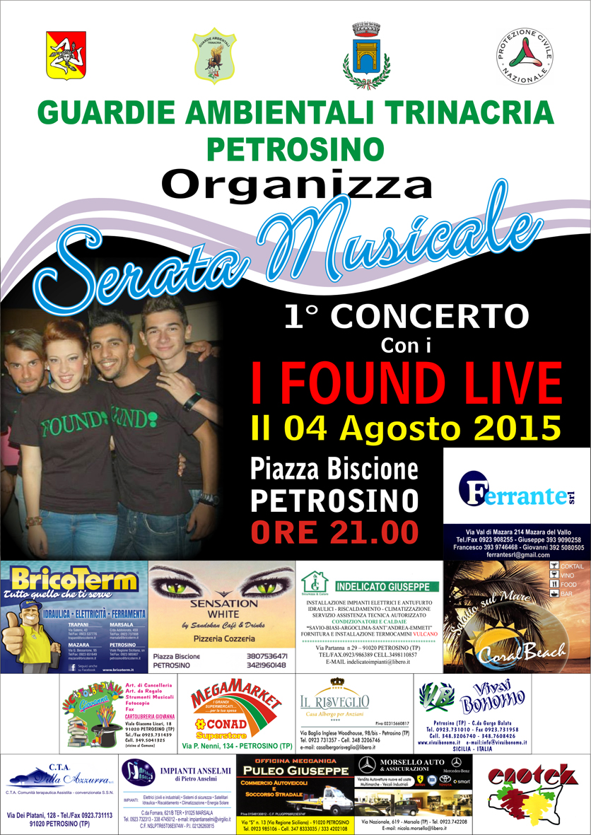 Domani sera, martedì 4 agosto, dalle ore 21.00 in piazza Biscione, - tra gli eventi del cartellone estivo -, l'Associazione Guardie Ambientali Trinacria organizza una serata musicale con il concerto live dei Found.