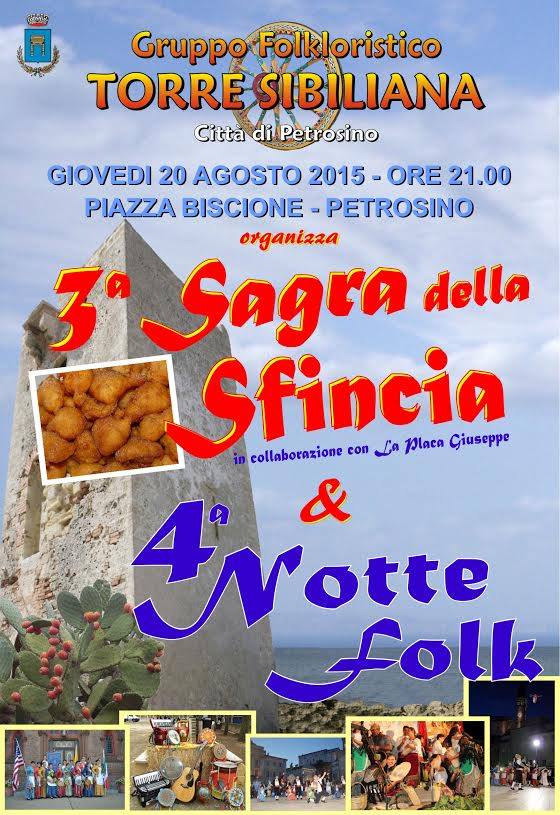 Questa sera, dalle ore 21:00 in piazza Biscione, il Gruppo Folkloristico Torre Sibiliana, dopo il successo degli anni passati, riconferma l’appuntamento con la 3^ edizione della “Sagra della Sfincia” e la 4^ “Notte Folk”. Una serata all’insegna della musica popolare siciliana con tre gruppi folkloristici che si esibiranno nei tradizionali canti e balli siciliani. E anche quest’anno, protagonista della serata, sarà la sfincia, con la degustazione in piazza del dolce tipico siciliano.