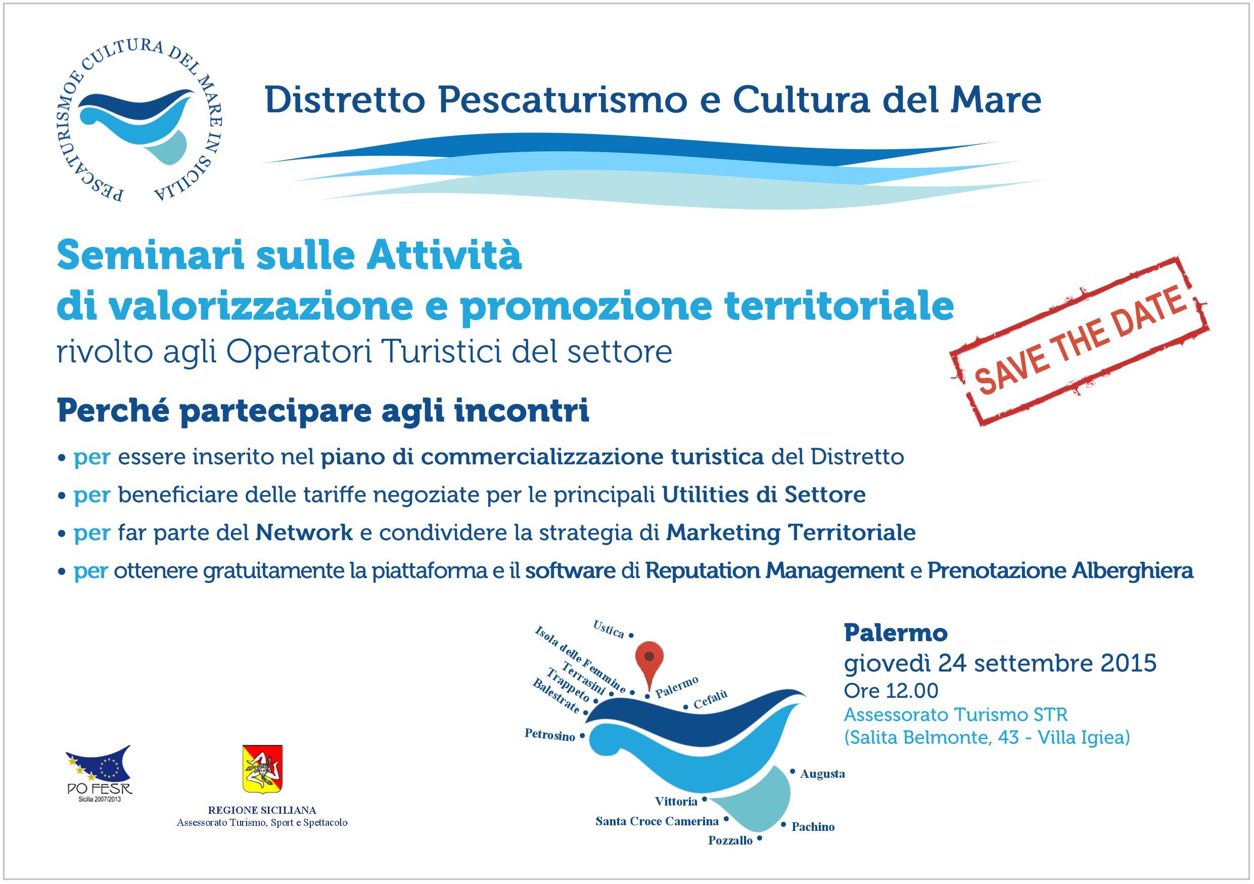 Si avvisano gli operatori turistici che il prossimo 24 settembre presso la sede dell’Assessorato Regionale al Turismo STR di Palermo (Villa Igiea), dalle 11.00 alle 13.30, si terrà il primo seminario sulle attività di promozione e valorizzazione territoriale, previsto dal progetto MDS, del Distretto Pescaturismo e Cultura del Mare.