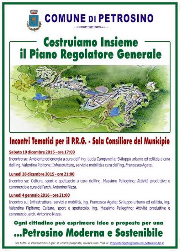 L’amministrazione comunale di Petrosino ricorda, che si terrà questa sera, dalle ore 21:00, presso l’aula consiliare del Palazzo Municipale, l’ultimo dei tre incontri tematici per il Piano Regolatore Generale. Sarà occasione di confronto e proposte su: Infrastrutture, servizi e mobilità; Sviluppo urbano ed edilizia; Cultura, sport e spettacolo; Attività produttive e commercio. Ricordiamo che gli incontri tematici, curati da cinque giovani professionisti di Petrosino, servono a raccogliere idee e proposte che saranno poi valutate per la redazione del nuovo Prg. Per chiedere informazioni o per inviare la propria idea è possibile farlo all’indirizzo mail: Prgpartecipato@comune.petrosino.tp.it
