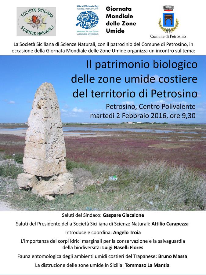 “Il Patrimonio biologico della zone umide costiere del territorio di Petrosino” è il titolo del convegno che si terrà, martedì 2 febbraio, con inizio alle ore 9:30, al Centro Polivalente di Petrosino. L’incontro, che si svolgerà in occasione della Giornata Mondiale delle Zone Umide, stabilite dalla Convenzione firmata a Ramsar, in Iran nel 1971, è patrocinato dal Comune di Petrosino e organizzato dalla Società Siciliana delle Scienze Naturali. L’evento vedrà la partecipazione e gli interventi da parte di docenti universitari dell’Università di Palermo che illustreranno l'importanza, il ruolo e la ricchezza naturalistica delle zone umide in generale, e dei margi petrosileni in particolare. Per maggiori informazioni, l’evento è pubblicato sul sito ufficiale della giornata mondiale delle zone umide www.worldwetlandsday.org, assieme a tutti gli altri eventi e le manifestazioni organizzate e dove si può vedere una mappa con la localizzazione di tutte le aree umide del mondo. Il programma del convegno prevede il saluto e l’intervento del Sindaco di Petrosino, di Attilio Carapezza, presidente della Società Siciliana di Scienze Naturali, l’intervento su “L’importanza dei corpi idrici marginali per la conservazione e la salvaguardia della biodiversità” del prof. Luigi Naselli Flores (docente di Scienze e Tecnologie Biologiche, Chimiche e Farmaceutiche), “Fauna entomologica degli ambienti umidi costieri del trapanese” del prof. Bruno Massa (docente di Scienze Agrarie e Forestali) e “La distruzione delle zone umide in Sicilia” del prof. Tommaso La Mantia (Scienze Agrarie e Forestali). I lavori del convegno saranno introdotti e coordinati da Angelo Troìa del dipartimento Stebicef, sezione botanica ed ecologia vegetale dell’università palermitana.