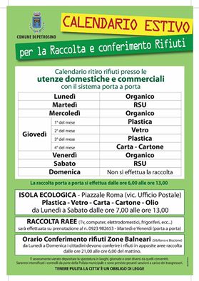 Combattere l’abbandono dei rifiuti e incrementare le percentuali di riciclo durante la stagione estiva è l’obiettivo che il sindaco del Comune di Petrosino, Gaspare Giacalone, si è posto per ottemperare alle diverse ordinanze emanate dal presidente della Regione Sicilia. A Petrosino, in particolare, è stato ampliato il raggio d’azione del servizio di raccolta dei rifiuti “porta a porta” su tutto il territorio, comprese le zone costiere.