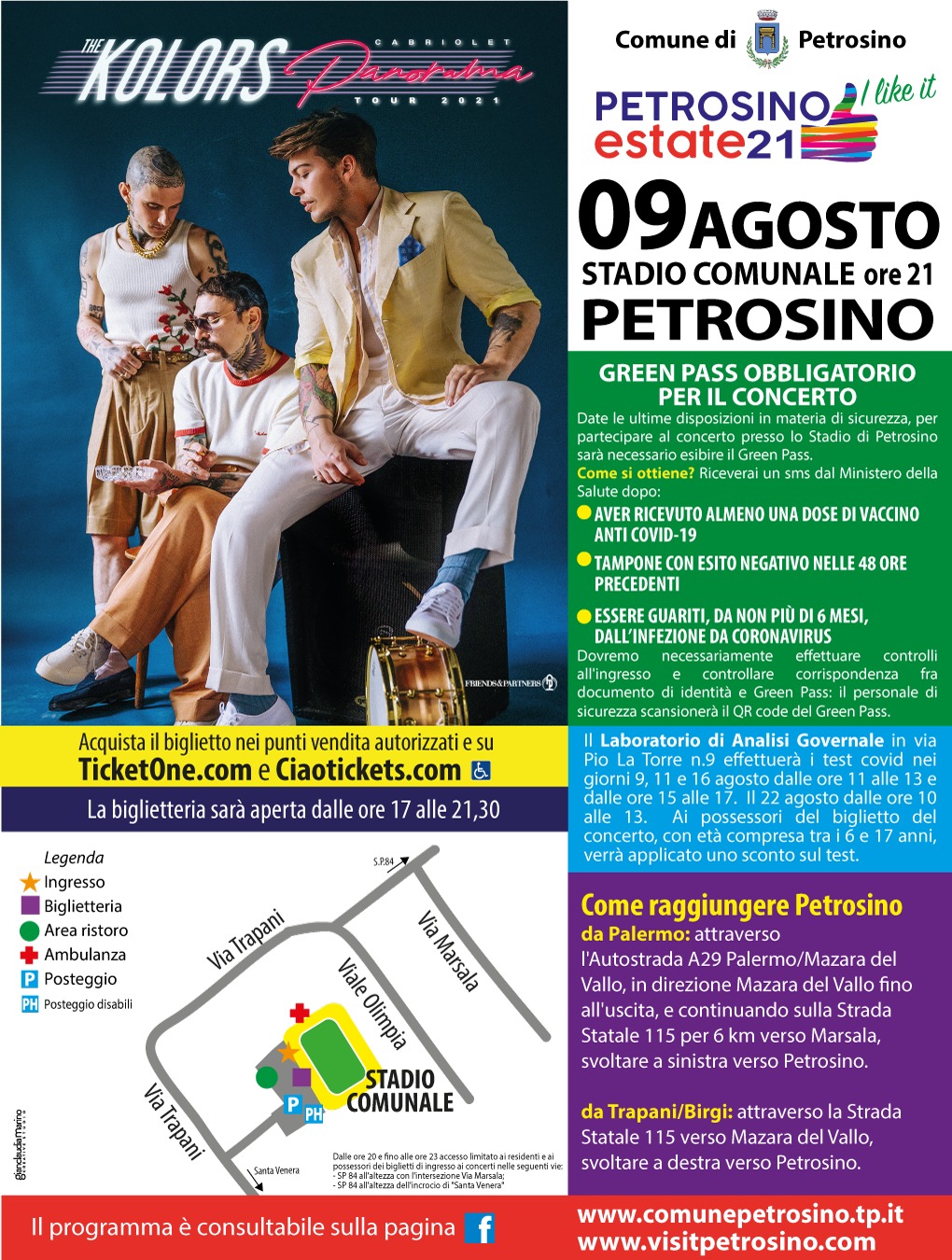 Si terrà lunedì prossimo (9 agosto) con inizio alle ore 21,30 il concerto dei The Kolors, uno degli appuntamenti di punta dell’Estate petrosilena 2021. La band, vincitrice del talent “Amici” nel 2015, si esibirà allo Stadio Comunale con i brani che negli anni hanno caratterizzato il loro successo tra il pubblico, come “Everytime”, brano tra i più programmati dalle radio italiane, e il recente “Cabriolet Panorama”. La band ha trionfato ai Kid’s Choice Awards 2016 di Nickelodeon (nella categoria “Cantante italiano preferito”) e ai Tim Music On Stage Awards come “Migliore Fan Base”, “Talento Italiano del Futuro” e “Miglior Look”.
