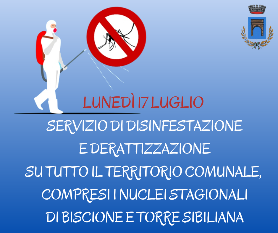 Lunedì 17 luglio sarà effettuato, su tutto il territorio comunale, compresi i nuclei stagionali di Biscione e Torre Sibiliana, il servizio di disinfestazione e derattizzazione: