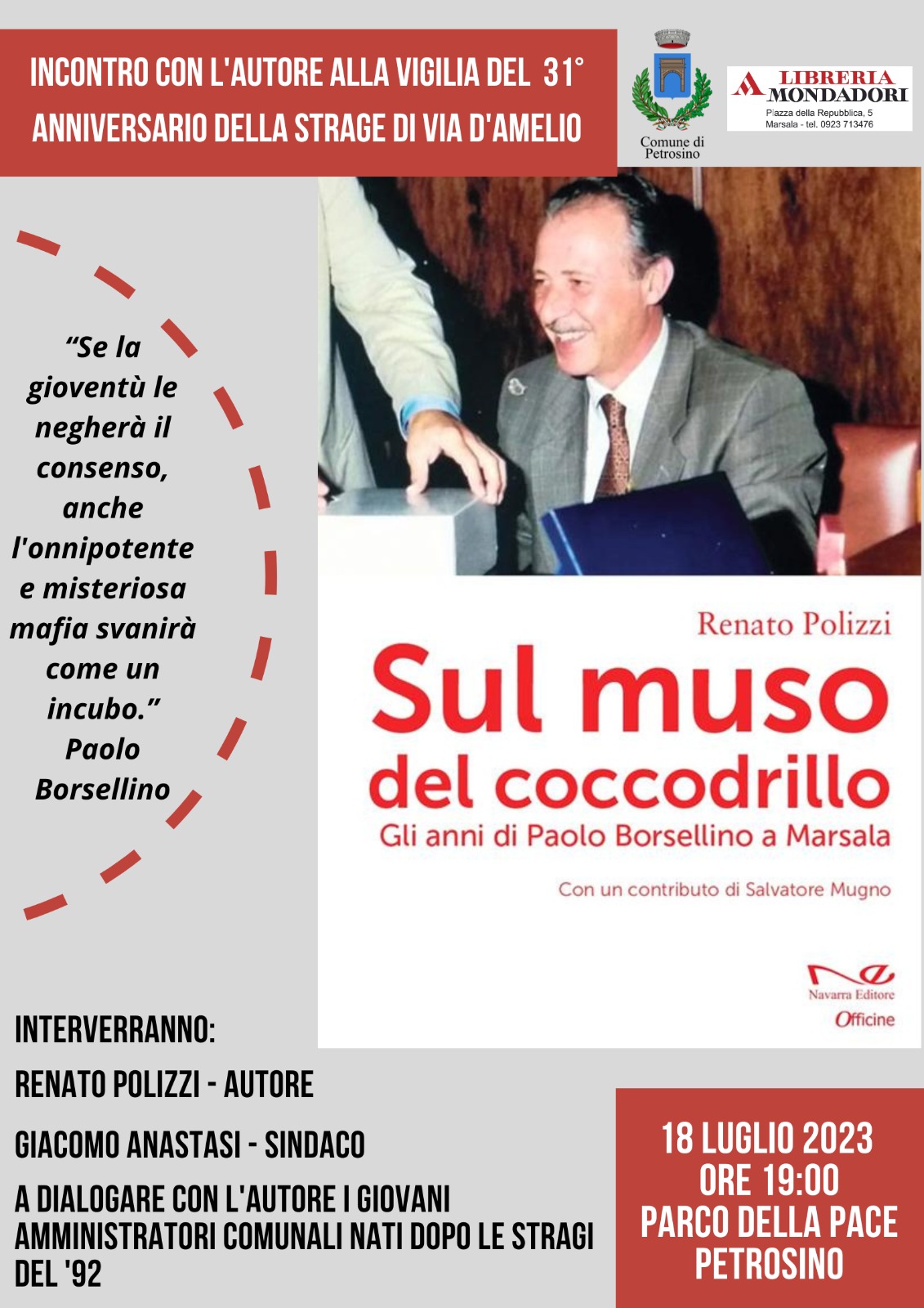 In occasione del 31° anniversario della strage di via D’Amelio, il Comune di Petrosino promuove un incontro con Renato Polizzi, autore del libro “Sul muso del coccodrillo. Gli anni di Paolo Borsellino a Marsala”, in programma martedì 18 luglio presso il Parco della Pace, alle ore 19.00.