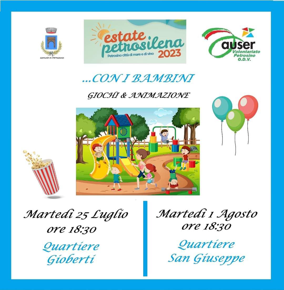 Si rinnova oggi, alle ore 18.30, nel quartiere San Giuseppe, l'appuntamento con l’iniziativa “…con i bambini”, con giochi e animazione per i più piccoli realizzata dall’Associazione Auser Petrosino.