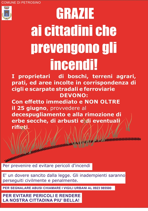 L’amministrazione comunale di Petrosino ha lanciato una campagna di sensibilizzazione dei cittadini per la prevenzione e la lotta agli incendi estivi. Nei giorni scorsi, il sindaco Gaspare Giacalone ha emanato un’ordinanza che impone a tutti i titolari di terreni, prati e aree incolte, nonché di quelli che si trovano in corrispondenza di strade e linee ferroviarie, di provvedere alla pulitura, al
